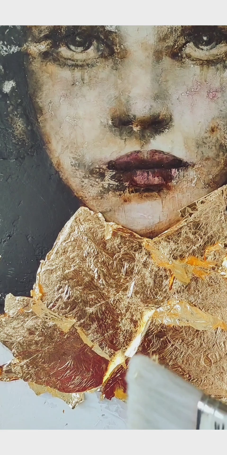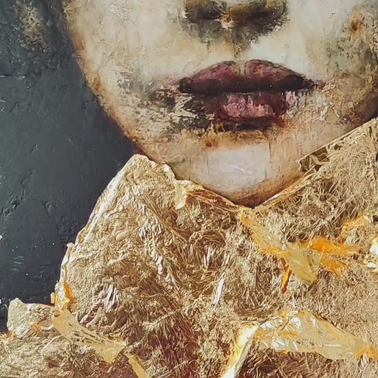 In quest'opera raffinata e spirituale, Simona Fedele ritrae una giovane figura femminile immersa in un’aura di dolcezza e speranza. Realizzato su stucco applicato a una cassetta di legno, il ritratto si illumina grazie all’uso sapiente della foglia oro, che crea un’aura luminosa sopra la testa della ragazza, richiamando iconografie antiche ma reinterpretate in chiave contemporanea.
